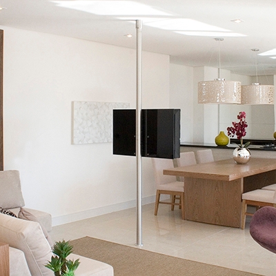 A linha especial de Suporte para TV Piso ao Teto em Aço Cromado, Aço Inox e Alumínio, é uma solução para ambientes que exigem combinações modernas em pinturas e acabamentos para pequeno, médio e grande espaço.